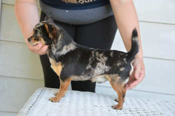 AKC Champion Grand-Sired Picasso is our new black n' tan merle foundation male! He was bred by Jodi Thurman and Mary Bachman, and is from Jaime Roach Walker. Picasso has splashy black and reddish-tan pigment! He is smooth-coated and carries long-coat. He has a sweet temperament with a handsome, sturdy conformation. We are excited to have him at Pooh Corner Chihuahuas!